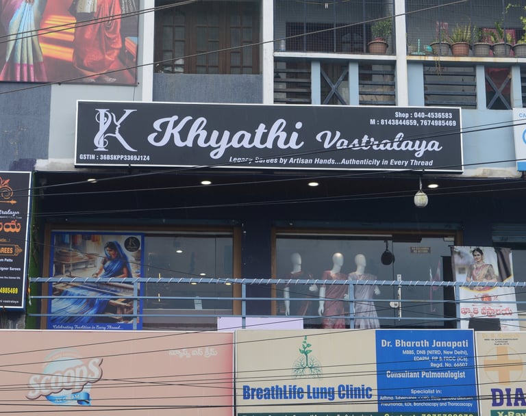 Connect with Khyathi Vastralaya today! Visit our Hyderabad store or reach out via phone for inquiries, orders or personalized assistance. We’re here to help you beautifully!